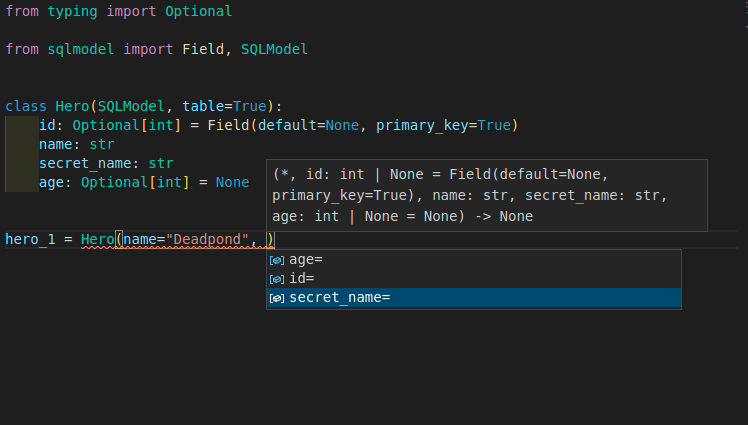 You won't need to keep guessing the types of different attributes in your models, if they could be None, etc. Your editor will be able to help you with everything because SQLModel is based on standard Python type annotations.