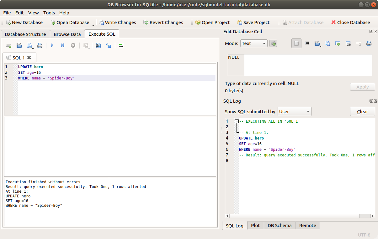 INFO Engine UPDATE hero SET age=? WHERE hero.id = ? INFO Engine [generated in 0.00017s] (16, 2) INFO Engine COMMIT -